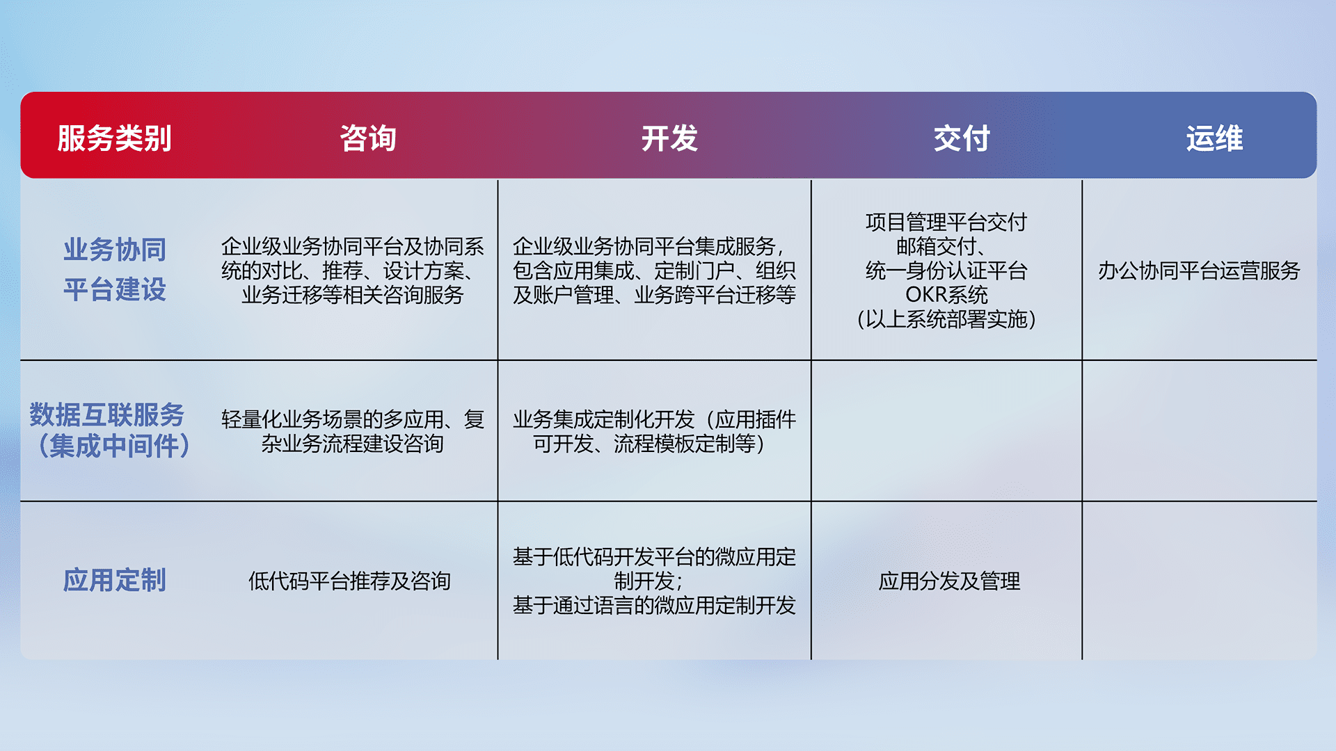 针对钉钉、、企微、、IDaas等平台级产品提供产品的规划、、、、方案、、交付、、、、定制化开发等服务,,,实现如统一协同办公、、、、智能客户服务、、混合会议管理、、、智能数据查询、、、、等业务场景,,,,实现数字化转型。。。。